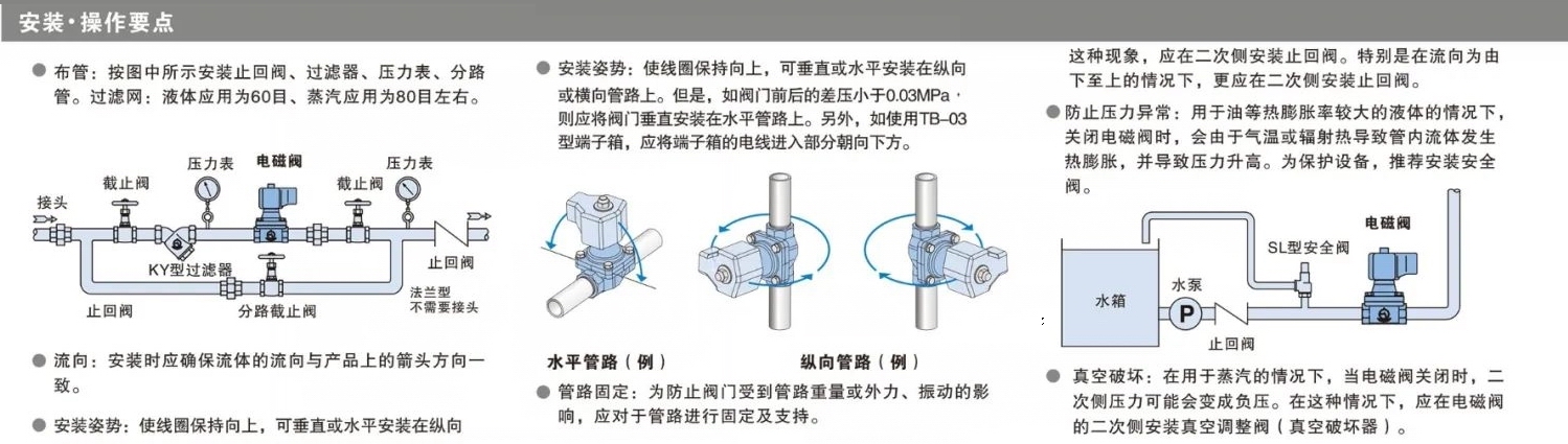 3、電磁閥不宜裝在管道低凹處,裝在容器的排出管道中,注意不可自容器底部引出,而應裝在容器底部稍上位置。