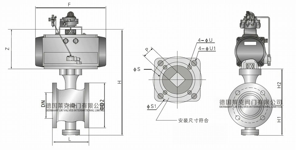 進口氣動V型球閥外形尺寸圖-德國萊克LIK品牌